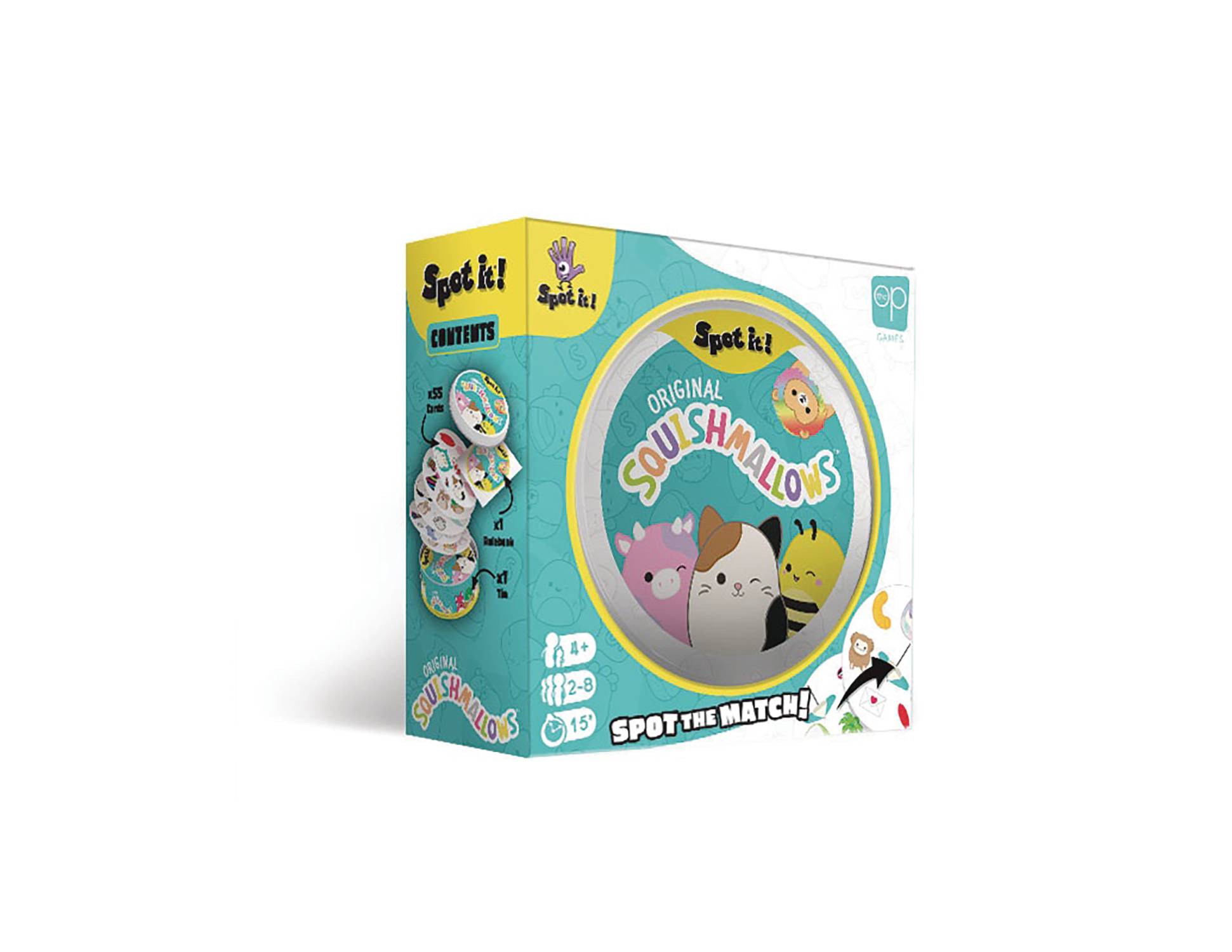 From USAopoly. Join the Squishmallows Squad in this fun and competitive pattern recognition game with a pop culture twist! In Spot It! Original Squishmallows, there is only one matching Squishmallow or item between any two cards. Be the first one to spot pairs of Squishmallows like Mila the Elephant or Cailey the Pink Crab, and symbols such as skateboards and rainbows, to collect and have the most cards at the end to win! USAopoly products must be sold in your brick & mortar store, or through a website you own. USAopoly products cannot be sold on Amazon, or any other third party website.